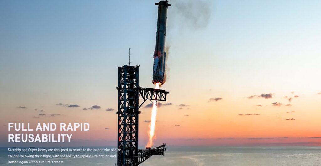 - 메카질라의 젓가락 포획 (스타십): 우주에서 마하의 속도로 떨어지는 ’20층짜리 엠파이어 스테이트 빌딩’을 지상에 닿기 직전, 거대한 강철 팔(젓가락) 두 개가 허공에서 정확히 낚아채는 것입니다. 건물에는 착륙용 다리가 없으니 그 무게만큼 화물을 더 실을 수 있습니다.